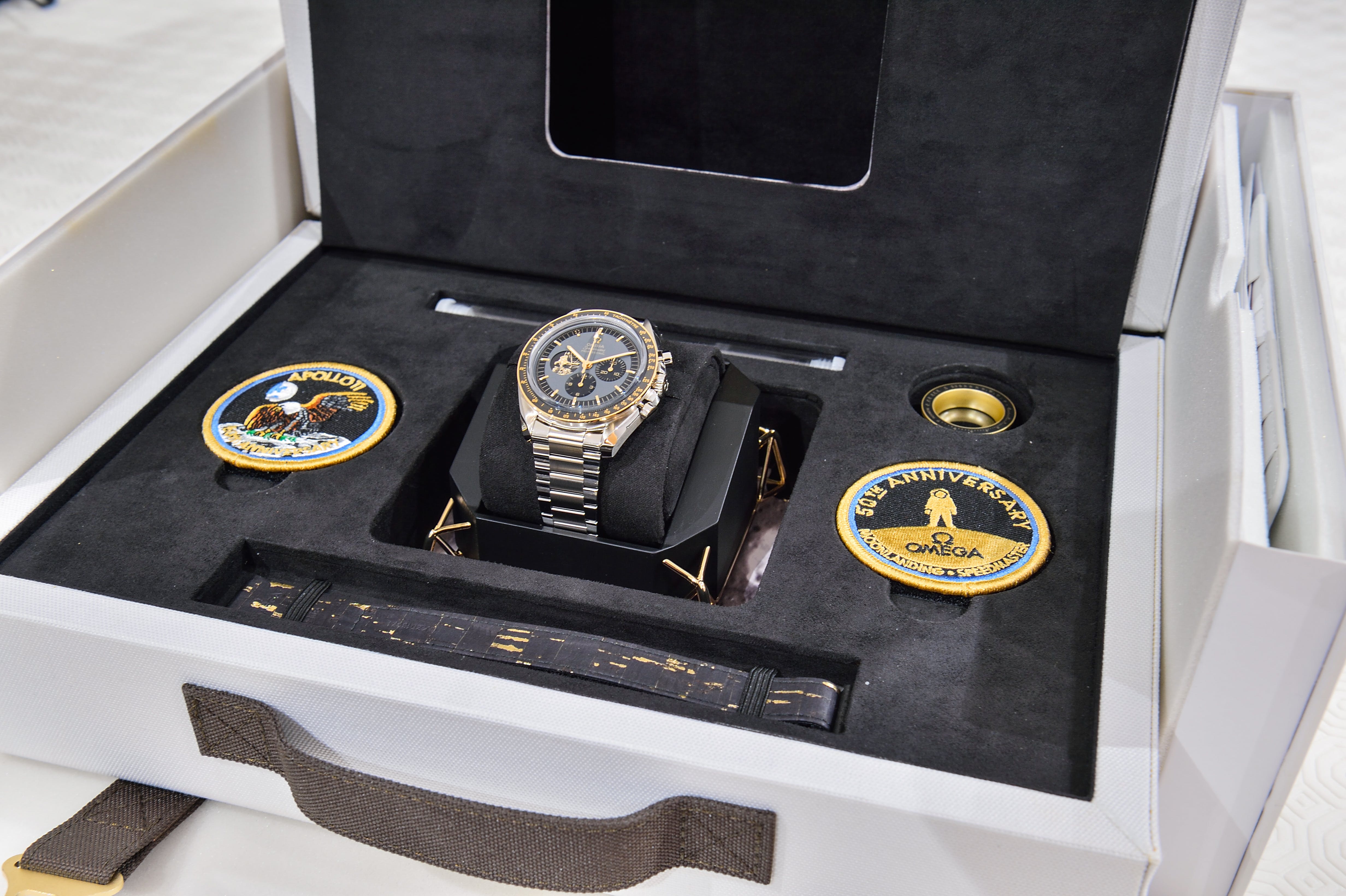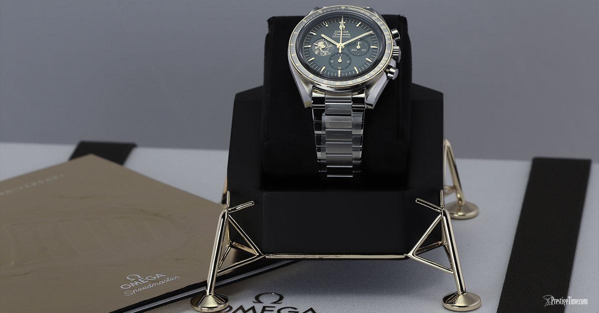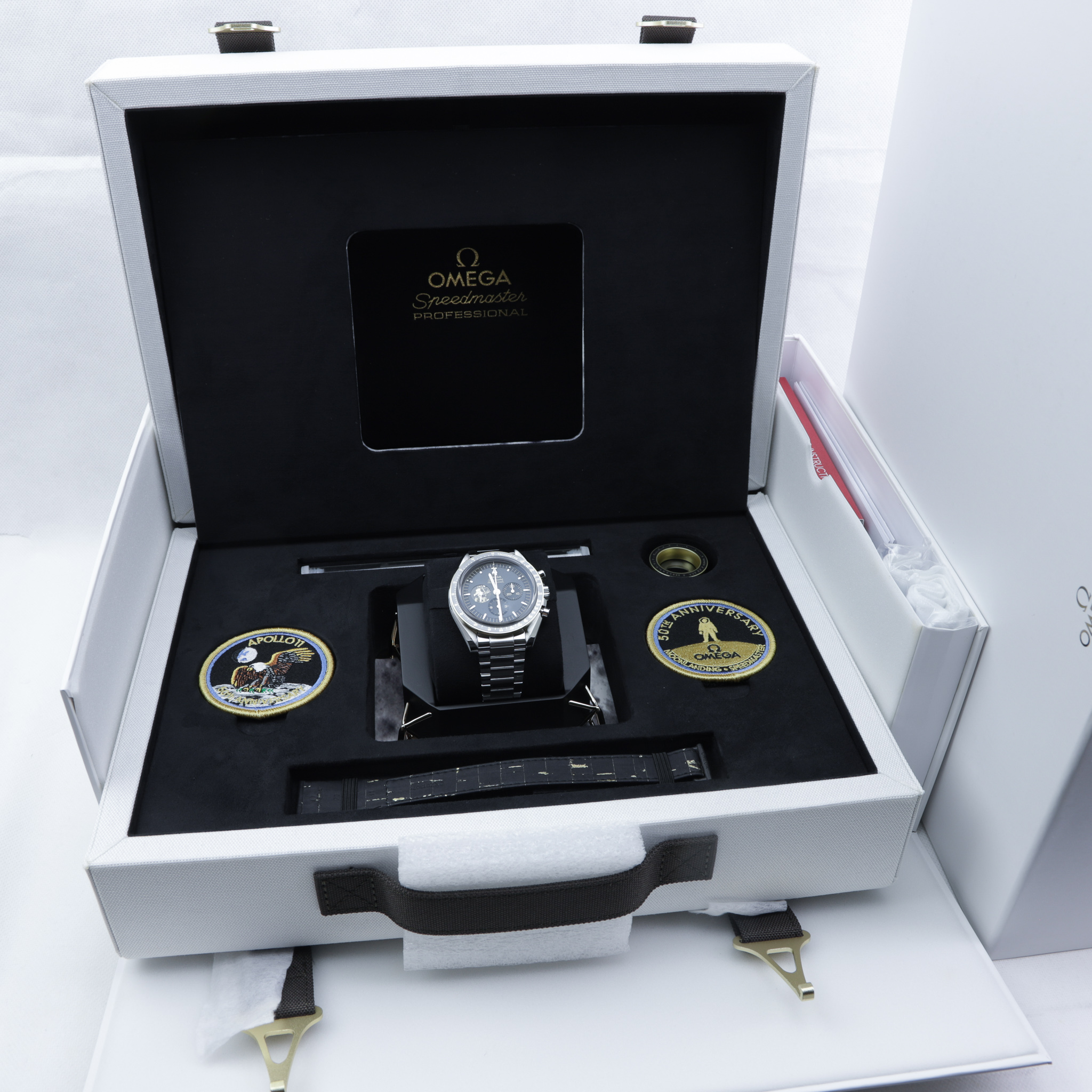 Two Apollo 11 tributes are found on the dial. A number “11” features in 18K Moonshine™ Gold at 11 o’clock. More notably, the 9 o’clock subdial shows Buzz Aldrin climbing down onto the lunar surface. This 18K Moonshine™ Gold subdial is blackened and laser-engraved. Total product weight (approx.): 138 g Between lugs: 20 mm Lug‑to‑lug: 47.5 mm Thickness: 13.1 mm Case: Steel Case diameter: 42 mm Water resistance: 5 bar (50 metres / 167 feet) Dial colour: Black Crystal: Domed scratch‑resistant sapphire crystal with anti‑reflective treatment on both sides Material: Steel Type of Clasp: Foldover clasp  THE OTHER SIDE One small step! The blackened decorative inner caseback shows Buzz Aldrin’s laser-engraved footprint on the lunar surface, while Neil Armstrong’s legendary quote is written in 18K Moonshine™ Gold-plated lettering.  MOONWATCH EVOLUTION The new OMEGA Master Co-Axial Calibre 3861 takes the next evolutionary step for the famous Moonwatch movement. Crafted with Co-Axial and anti-magnetic technology, it now reaches the superior Master Chronometer standard of precision, chronometric performance and magnetic resistance.  GUARANTEE Our watches go through a rigorous authentication process in which seasoned experts examine and evaluate the watches. These experts have decades of experience and have authenticated thousands of watches in their lifetime.  Why choose us? - We work directly with manufacturers around the world to ensure the best quality of our products . We have a quality control department to help us keep our promises!